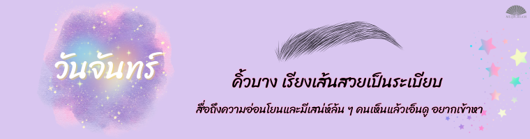 วันจันทร์ : คิ้วบาง เรียงเส้นสวยเป็นระเบียบ สื่อถึงความอ่อนโยนและมีเสน่ห์ล้น ๆ คนเห็นแล้วเอ็นดู อยากเข้าหา