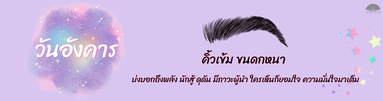 วันอังคาร : คิ้วเข้ม ขนดกหนา บ่งบอกถึงพลัง นักสู้ ดุดัน มีภาวะผู้นำ ใครเห็นก็ยอมใจ ความมั่นใจมาเต็ม