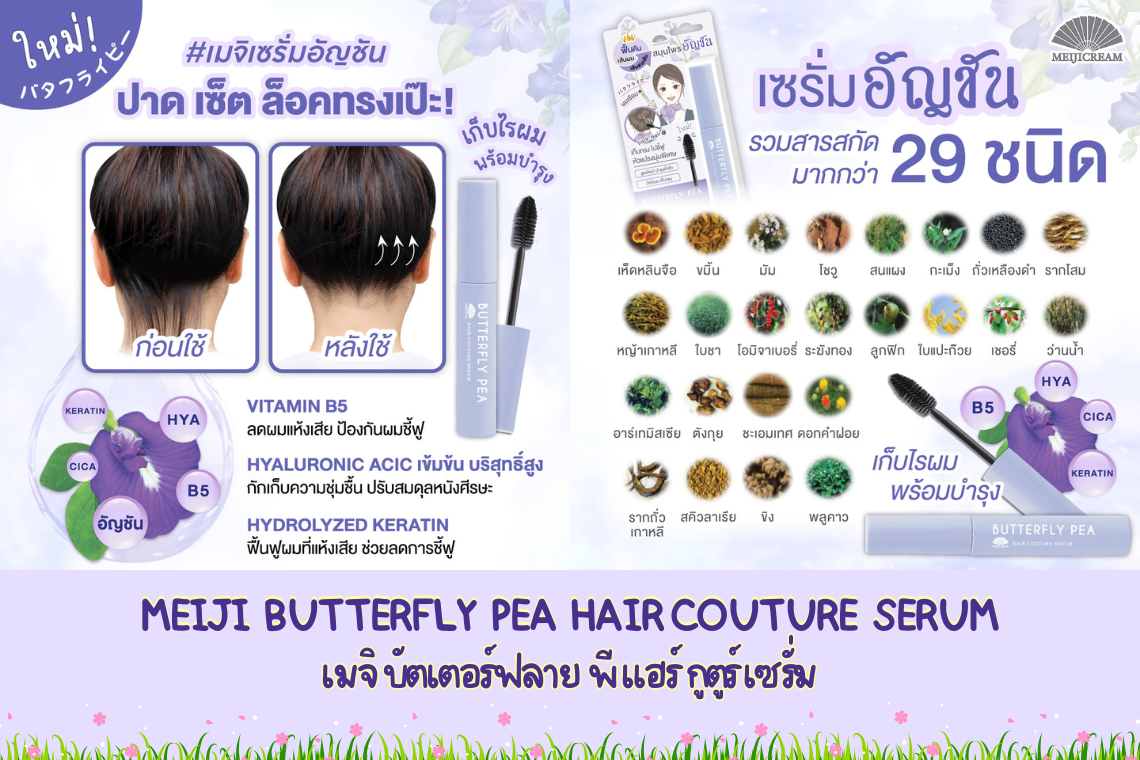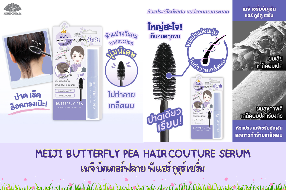 1. MEIJI BUTTERFLY PEA HAIR COUTURE SERUM – เซรั่มเก็บไรผมสุดปังในรูปแบบแท่ง พร้อมหัวแปรงวีแกน ทรงกระบอก นุ่มพิเศษ ไม่ทำลายเกล็ดผม จัดทรงเป๊ะพร้อมบำรุงในหนึ่งเดียว
