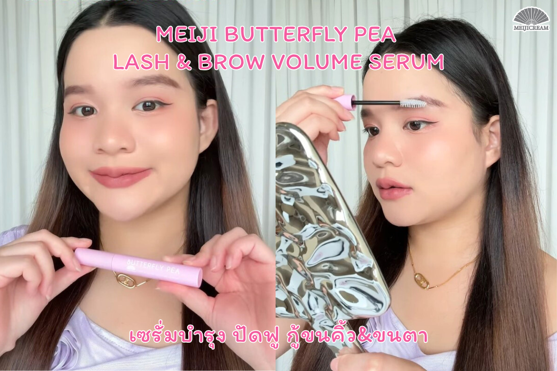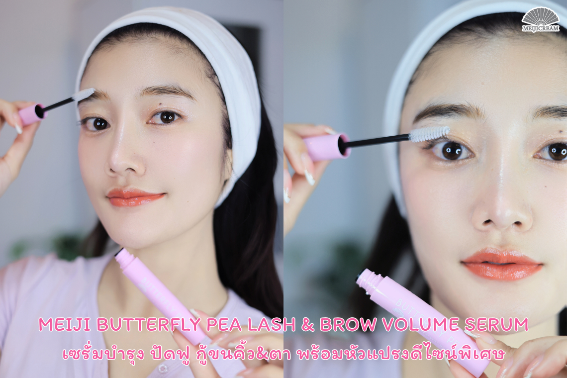คุณพีชบอกว่า เมจิเซรั่มอัญชันปัดฟู กู้ขนคิ้วขนตา MEIJI BUTTERFLY PEA LASH & BROW VOLUME SERUM แพ็คเกจน่ารักมาก หัวแปรงแบรนด์อื่นจะเป็นไนลอนซึ่งจะบาดเกล็ดผม ขนคิ้ว ขนตาได้ แต่เมจิเซรั่มอัญชัน พัฒนาหัวแปรงดีไซน์พิเศษ ฟู นิ่ม รับกับรูปตา ปัดทั่วถึงได้เส้นต่อเส้น มาพร้อมกับสารสกัดสำคัญอย่าง อัญชัน ผักบุ้งทะเล โสม และรากชะเอม สามารถงัดขนตาเด้ง คิ้วอุย บำรุงคิ้วขนตาลึกจากราก จากสารสกัดออร์แกนิก จากสมุนไพรเกาหลีเข้มข้นกว่า 26 ชนิด เยอะมากที่สุดเท่าที่เคยลองใช้มา ใครที่ต่อขนตาบ่อย ติดขนตาปลอม สักคิ้ว แนะนำเลย! ตัวช่วยให้ขนคิ้ว ขนตาแข็งแรง ไม่หลุดร่วงง่าย