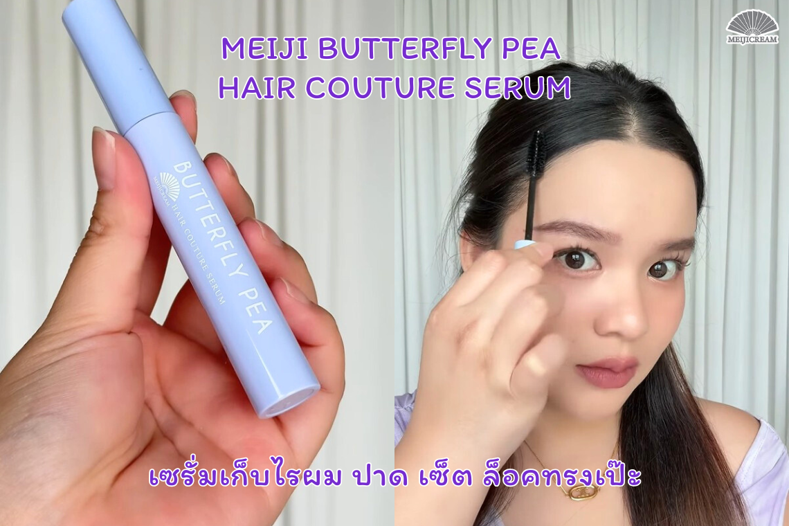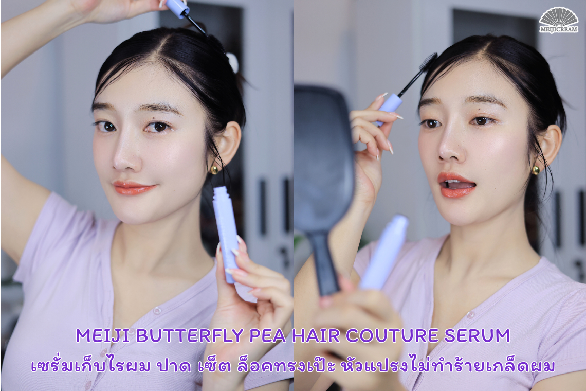 ในส่วนของ MEIJI BUTTERFLY PEA HAIR COUTURE SERUM มาพร้อมหัวแปรงดีไซน์พิเศษ ฟู นิ่ม กระจายเนื้อเซรั่มได้ดี และที่สำคัญคือ เก็บไรผมได้ง่าย หัวแปรงออกแบบมาเหมือนเส้นขนจริง ทรงกลม ไม่ทำร้ายเกล็ดผม มาพร้อมสารสกัดสำคัญอย่างอัญชัน เคราติน ไฮยาฯ วิตตามินB5 และสารสกัดออร์แกนิกจากสมุนไพรเกาหลีรวมกว่า 29 ชนิด ปาดเดียวเอาอยู่ เก็บไรผม อยู่ทรงทันที โดยไม่ต้องหวีซ้ำ เนื้อเซรั่มสีใส ซึมไว ไม่ทิ้งคราบ ไม่เหนียว แล้วก็ไม่แข็งเหมือนใช้เจล หรือว่าสเปรย์ ได้ลองเปรียบเทียบให้ดูระหว่างก่อนใช้ กับหลังใช้ ผมคือเป๊ะมาก